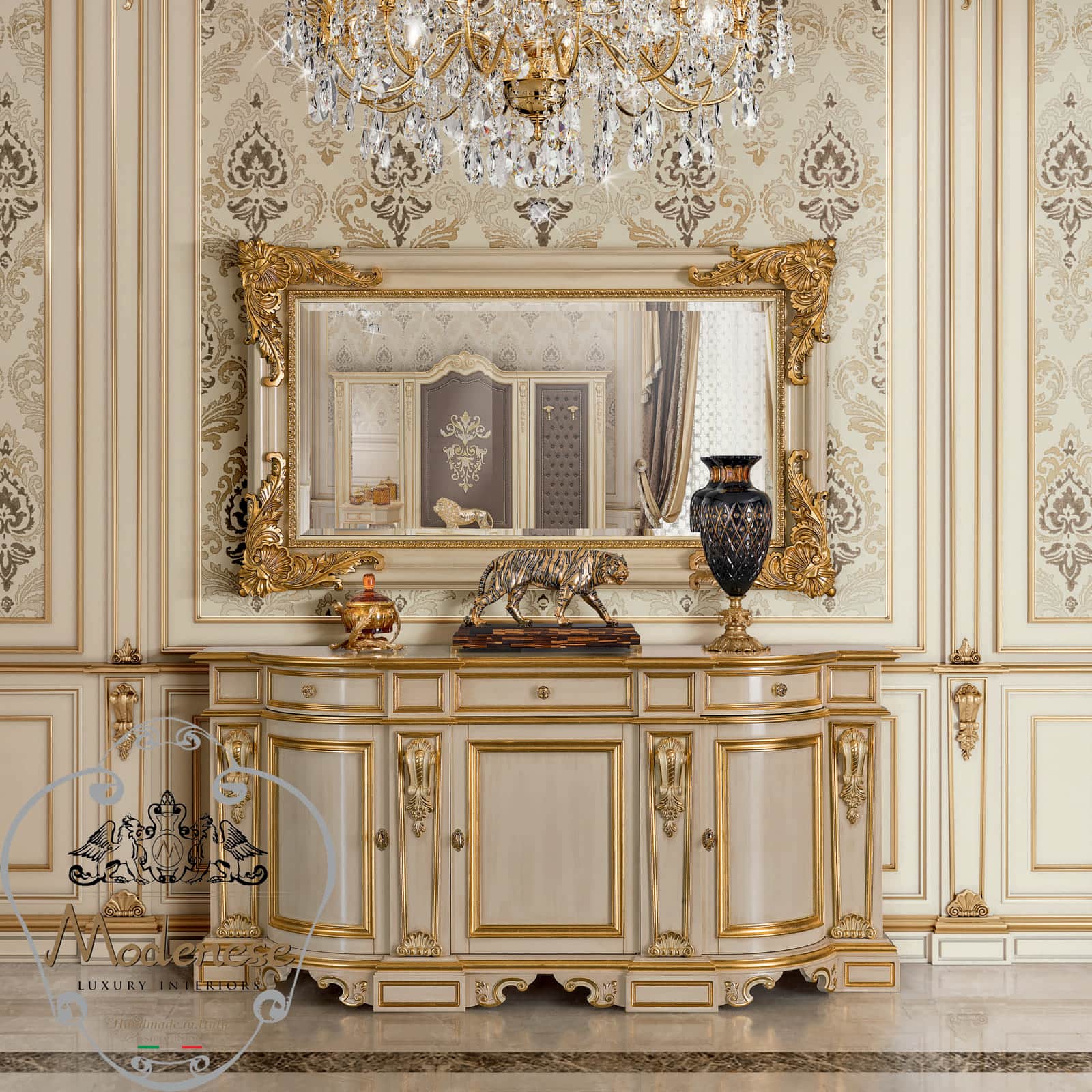 Modenese Luxury Interiors is renowned as a leading name in the interior design industry and a distinguished Italian manufacturer. With a worldwide reputation for excellence, our company stands at the forefront of crafting luxurious, timeless spaces that showcase the real Italian craftsmanship. Specializing in high-end interiors, we combine traditional techniques with contemporary elements, ensuring each design not only meets but exceeds the expectations of our discerning clientele. Our signature approach blends artistic creativity with the finest materials, all made in Italy, to create interiors that are both sophisticated and iconic.