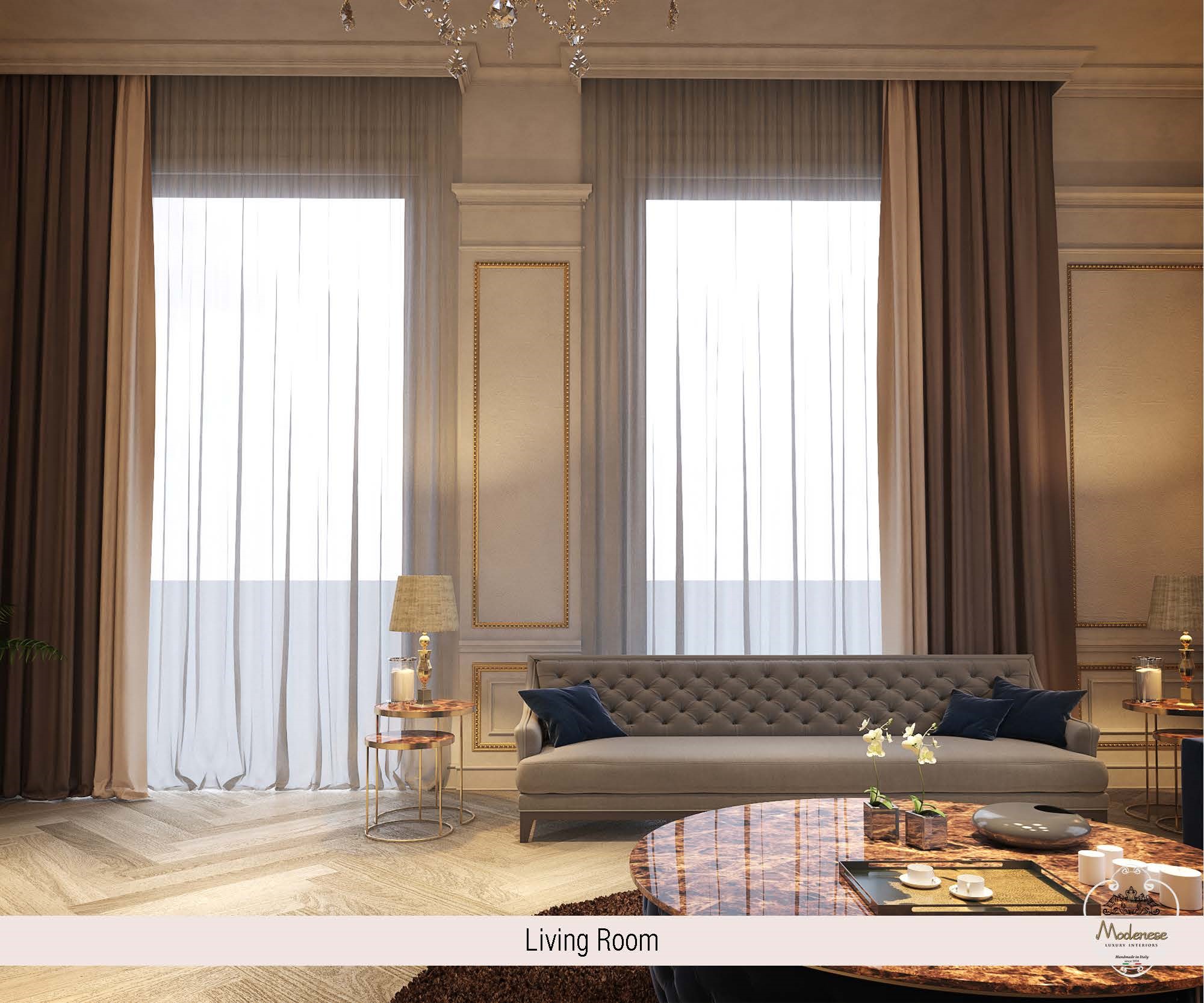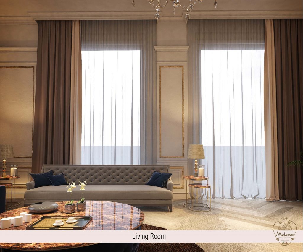 And a massive chandelier’s mirrors and crystal pendants are played with lovely highlights both during the day and at night. This project’s curtain design is really stunning, with a gorgeous blend of milky cream and chocolate tones. Using pricey metal holders, silk is skillfully and gracefully folded into lovely curtain folds. This is a perfect illustration of how accessories may influence the mood and cheerful appearance of the space.
