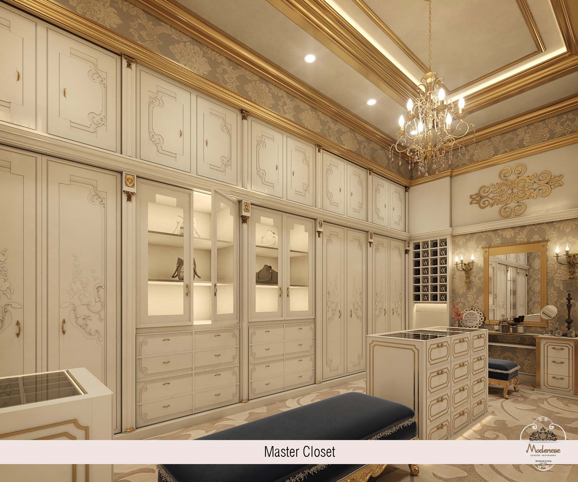 A traditional dressing room with gold patina exudes flair, grace, and unrivaled taste. Modenese Luxury Interiors Company designers tackled the implementation of the customer’s ideas with skill and delivered a well-thought-out design proposal. Each ornamental detail of the dressing room contributes to the classics’ natural sophistication and elegance.