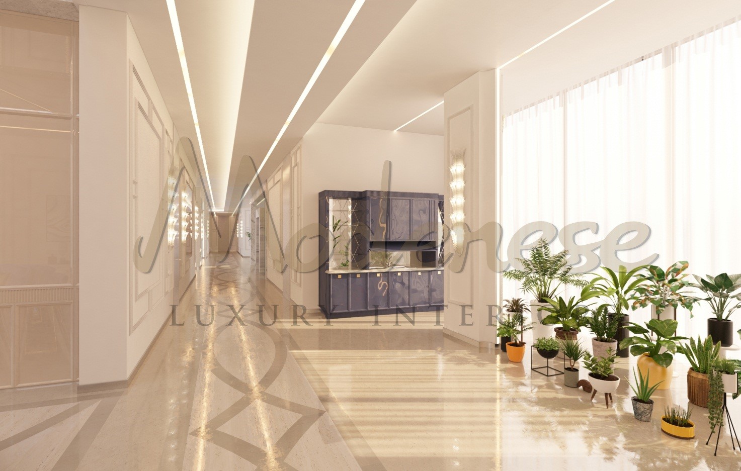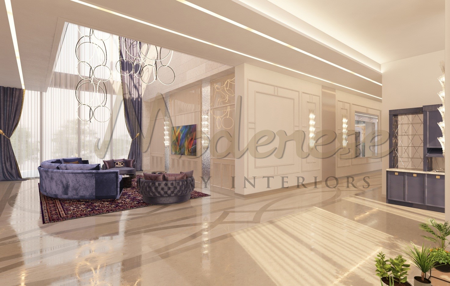 In modern homes, the hall is a large entrance space, designed for waiting, relaxing and meeting. Coming to your house, the guest first of all gets into the hall, therefore, by its design an impression about the whole house is created. The thoughtful interior of the hall you can order in Modenese Luxury Interiors, which will emphasize your impeccable taste and status of your house.