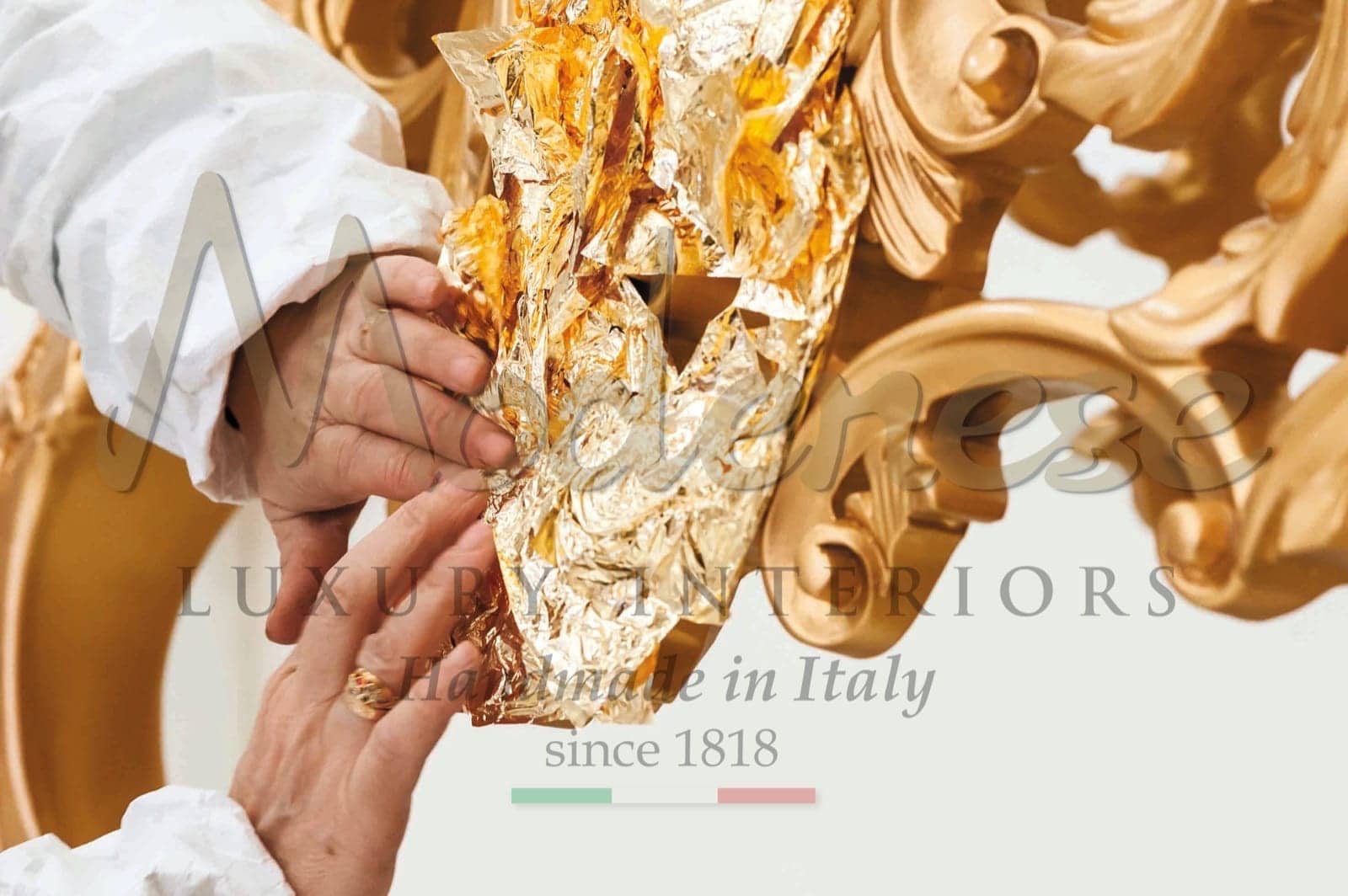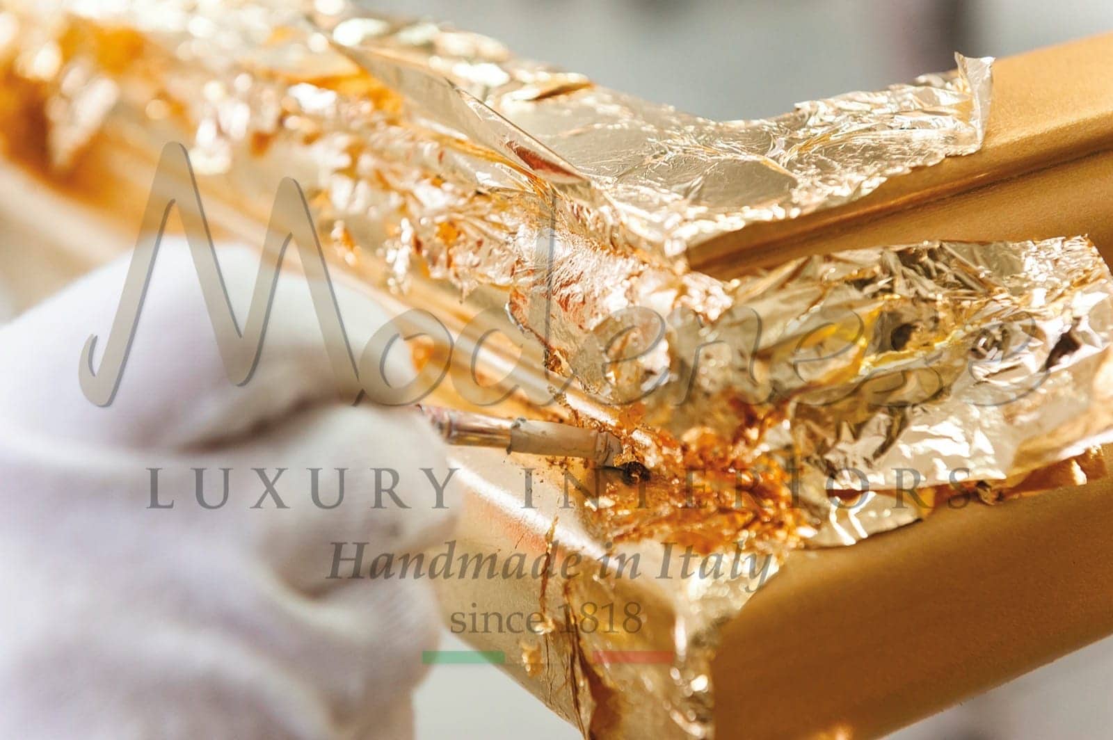 Modenese Luxury Interiors produces top quality golden leaf handmade plated furniture. We decorate furniture and interiors with 24k gold leaf handmade traditional application.