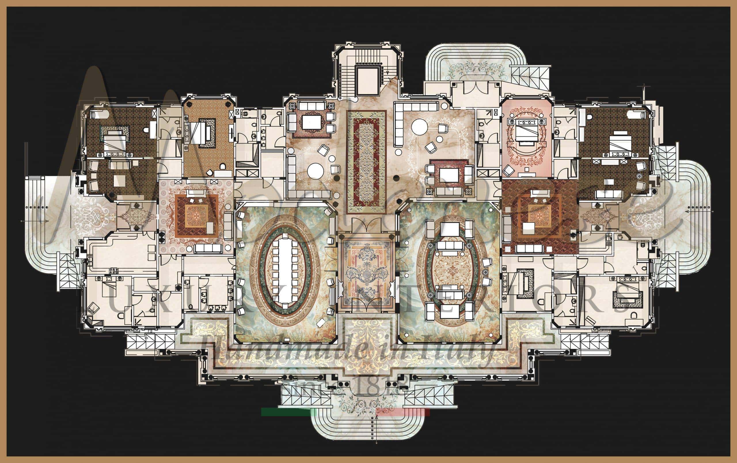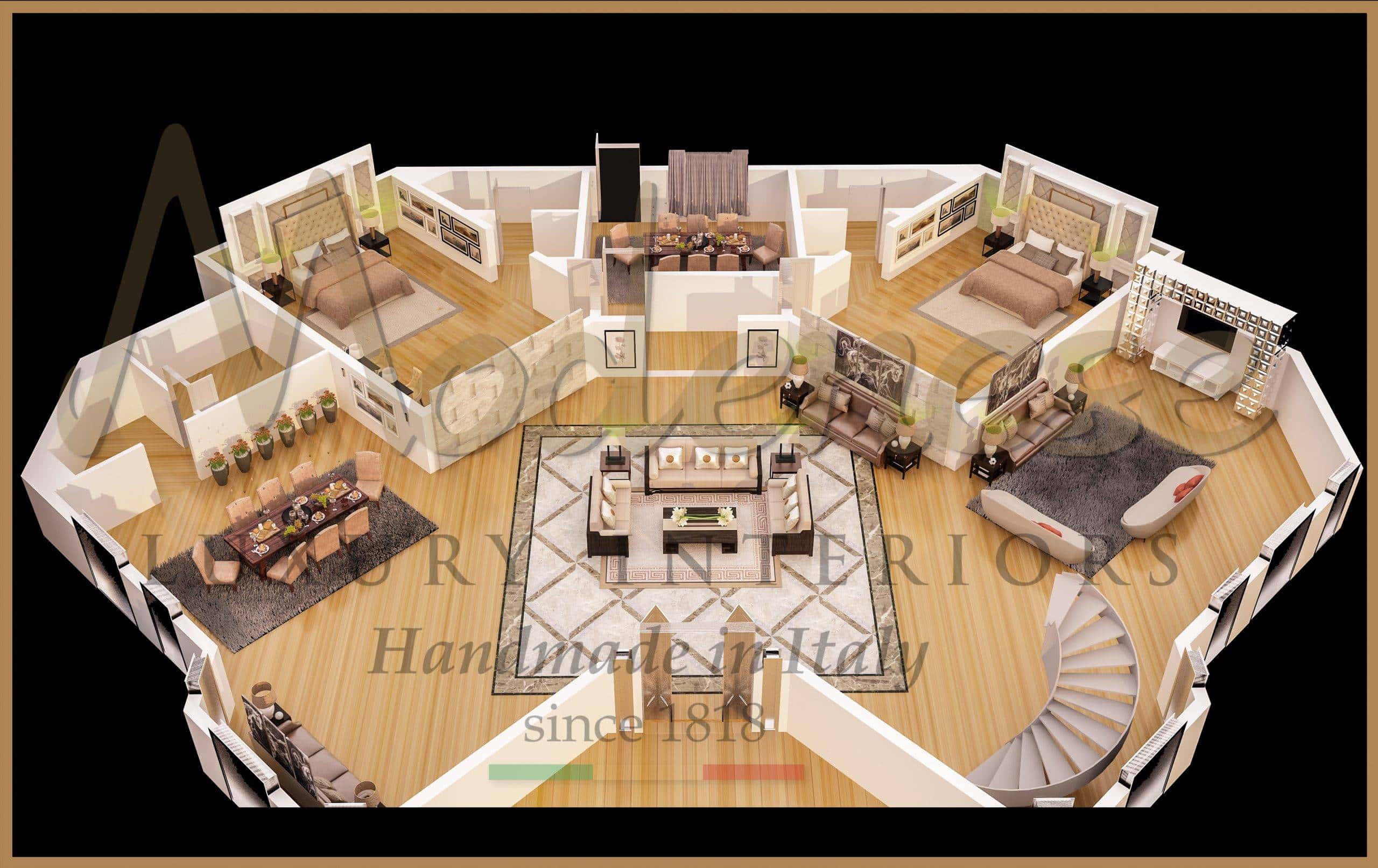 Architecture layout study for an elegant and classy interior design project service. Choose Modenese Luxury Interiors to design the full interior project of your royal villa and residential palace. We provide you with the best classic interiors solutions, your favorite