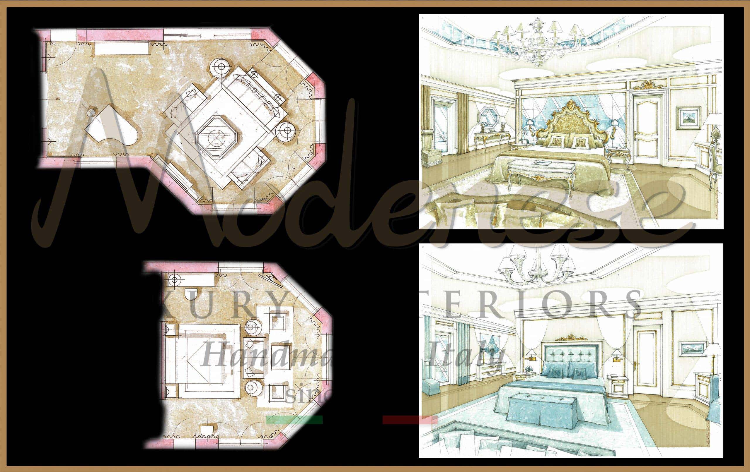 Once we complete the study of the layout of a project, our skilled team of designers and architects will suggest the best design concept suitable for your luxury project with professional care and attention to your ideas. The best selection by Modenese interior design service for your luxurious palace project. Our worldwide classic project experience, especially in Russia, Middle East and Africa, makes us master artisans in designing and producing the best quality home decorations.