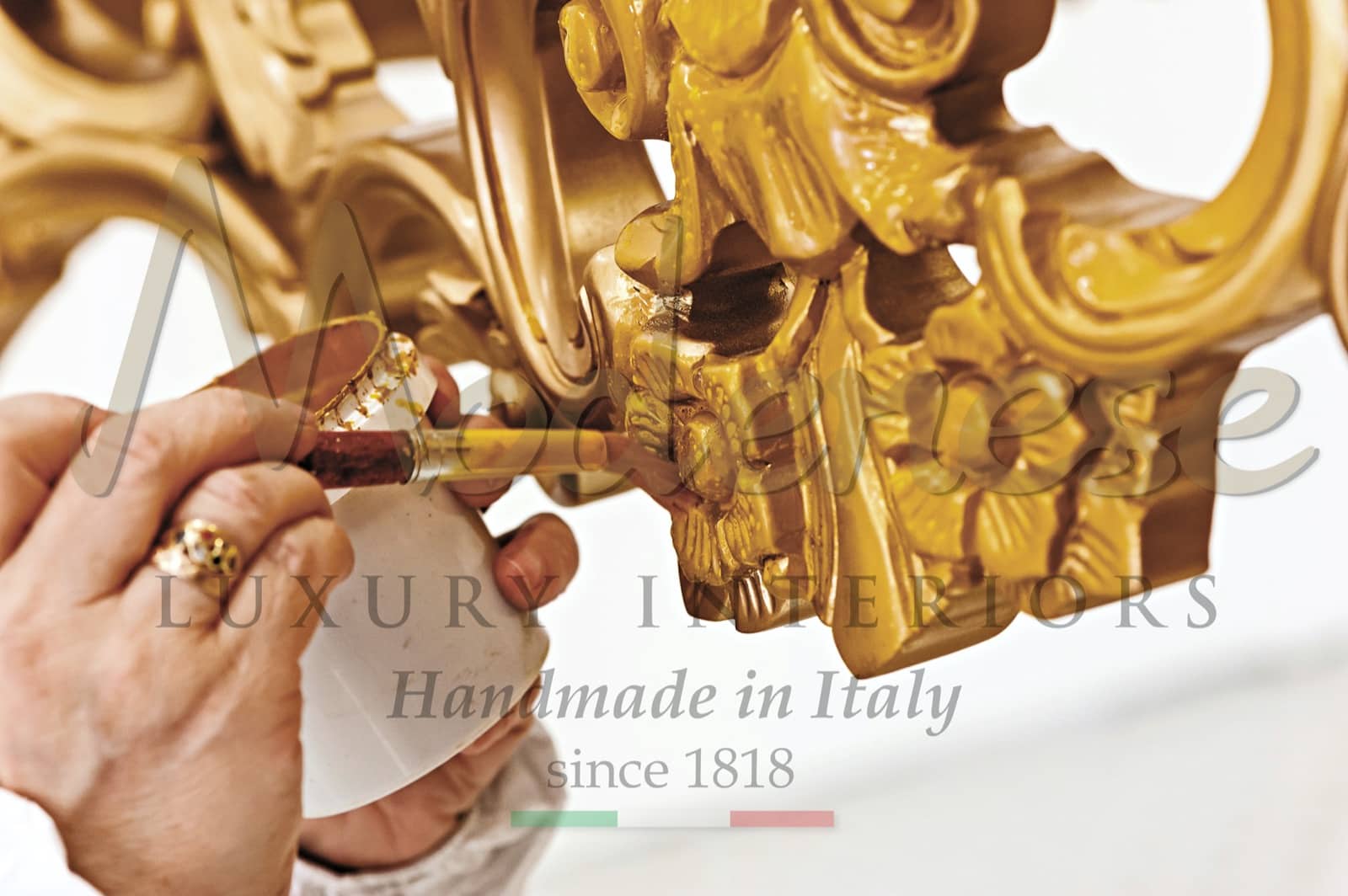 Modenese Luxury Interiors produces top quality golden leaf handmade plated furniture. The process consists on applying golden leaf on solid wood. This provides a luxurious and baroque touch.