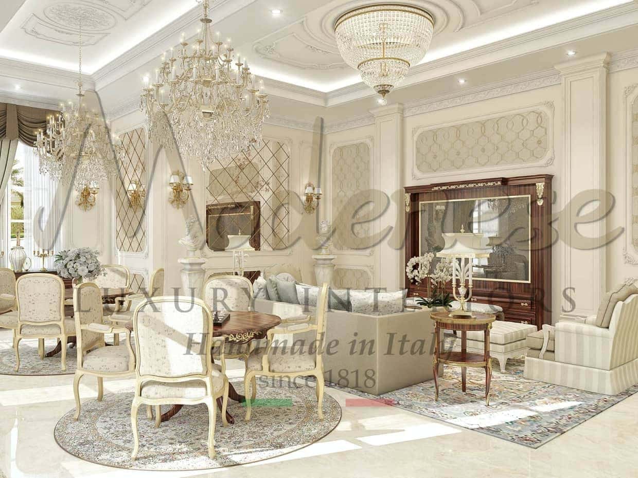 A graceful and sophisticated classic style living room in an elegant royal villa: all tastefully decorated and handcrafted by Modenese Luxury Interiors. High-end quality and best Italian design all gathered together in a comfortable sitting area.