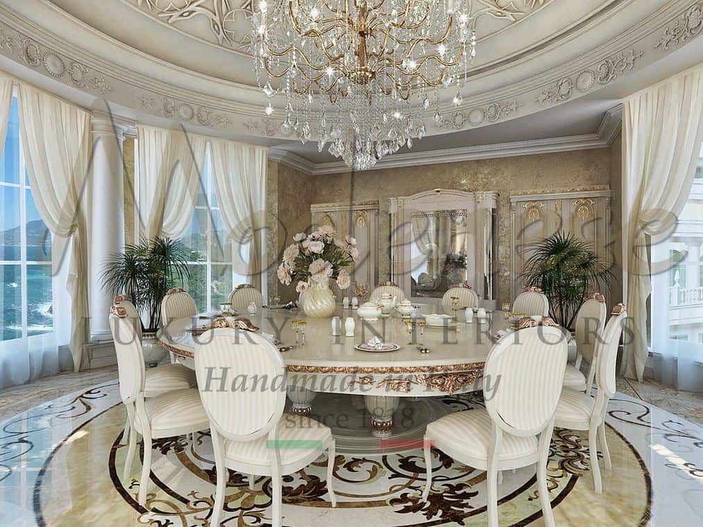 Royal villa’s dining room with sophisticated handcrafted chairs. All perfectly matched with elegant solid wood handmade decorations for a perfect charming atmosphere that will distinguish your home exclusive furnishing project.