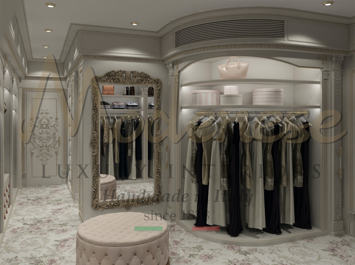 In a classic style, the dressing room can be very sophisticated and very aesthetic. Various colors can be used here – beige with gold, beige with blue accents, dark wood with scarlet nuances and many other options. Dressing room interior design also has the right to be fun. A symphony of textures and facades, beautiful details and an unusual form of furniture can be present in this area.