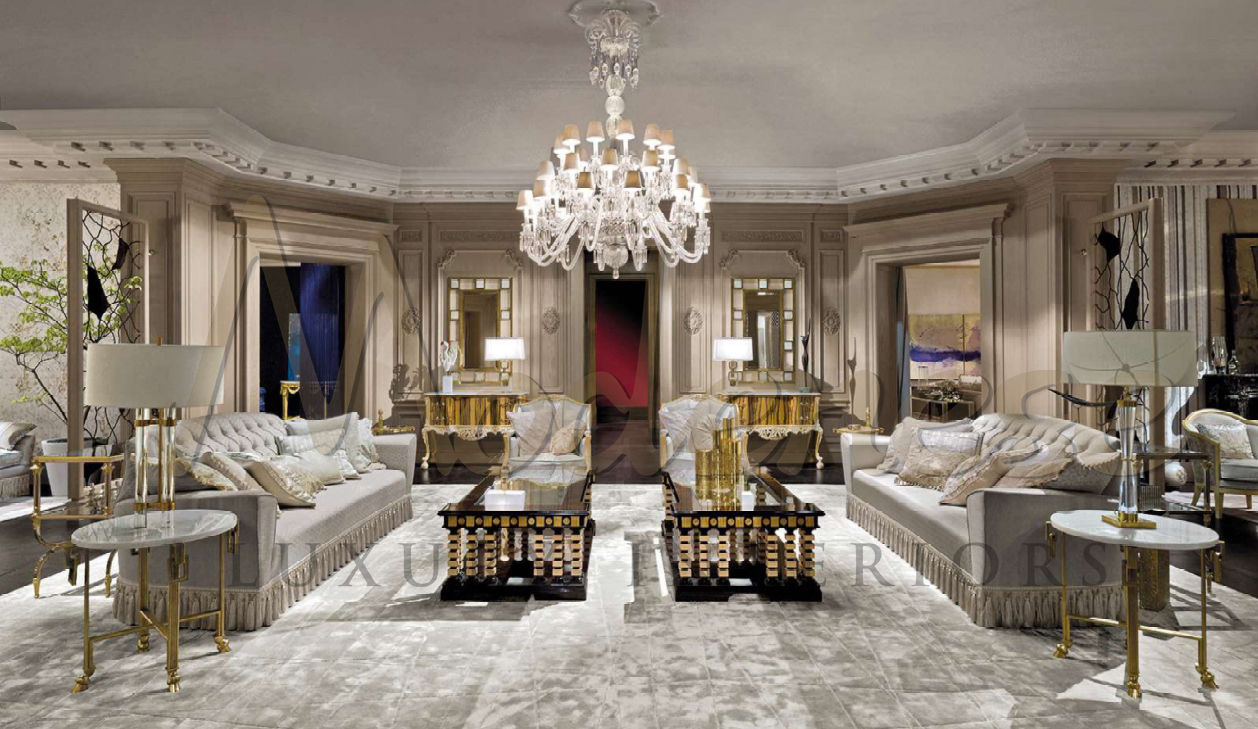 If you order a classic design from Modenese Luxury Interiors, you’ll get natural and luxurious materials, exquisite colors, finishing that calls to mind natural elements both to the touch and the eye, and a relaxing atmosphere that welcomes guests with soft architecture, curvy fashionable furnishings, and delightful lighting. The ceiling in the traditional living room from our design and architecture studio emphasizes the center, which is enhanced by the magnificent designer chandeliers installed there made of pricey crystal with imitation candles and elegant crystal pendants framed by a stucco decor in the shape of a rosette. The entire perimeter of the ceiling is decorated with ceiling stucco as a complex pattern and borders, which are used in pairs.