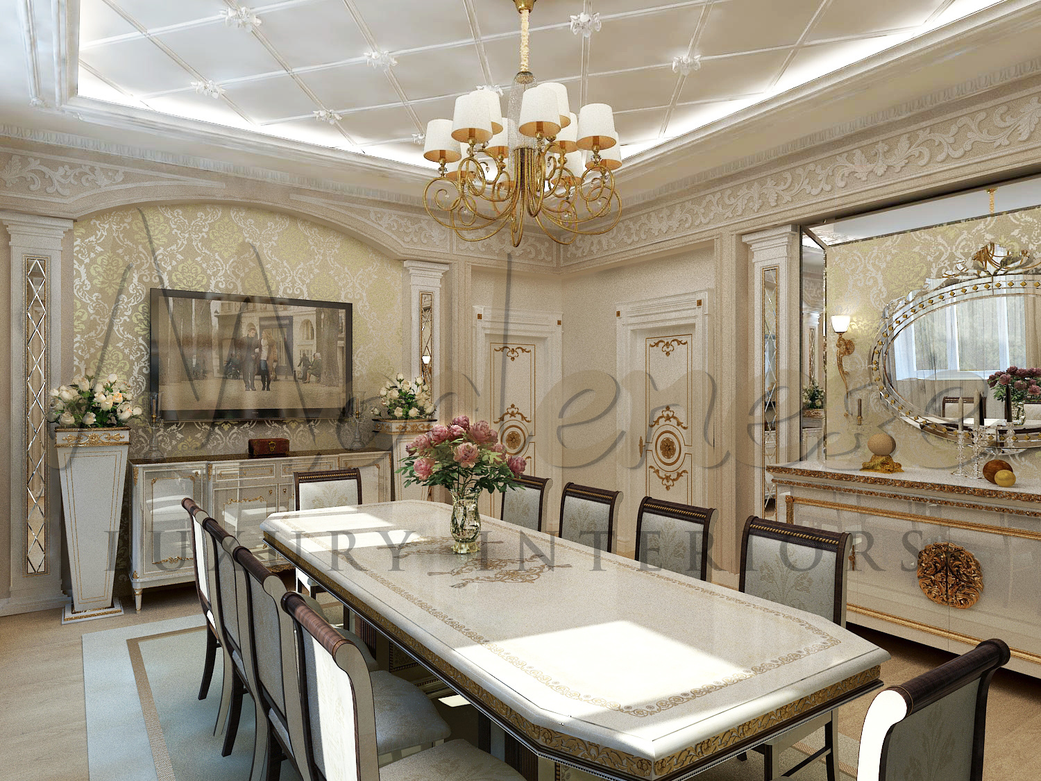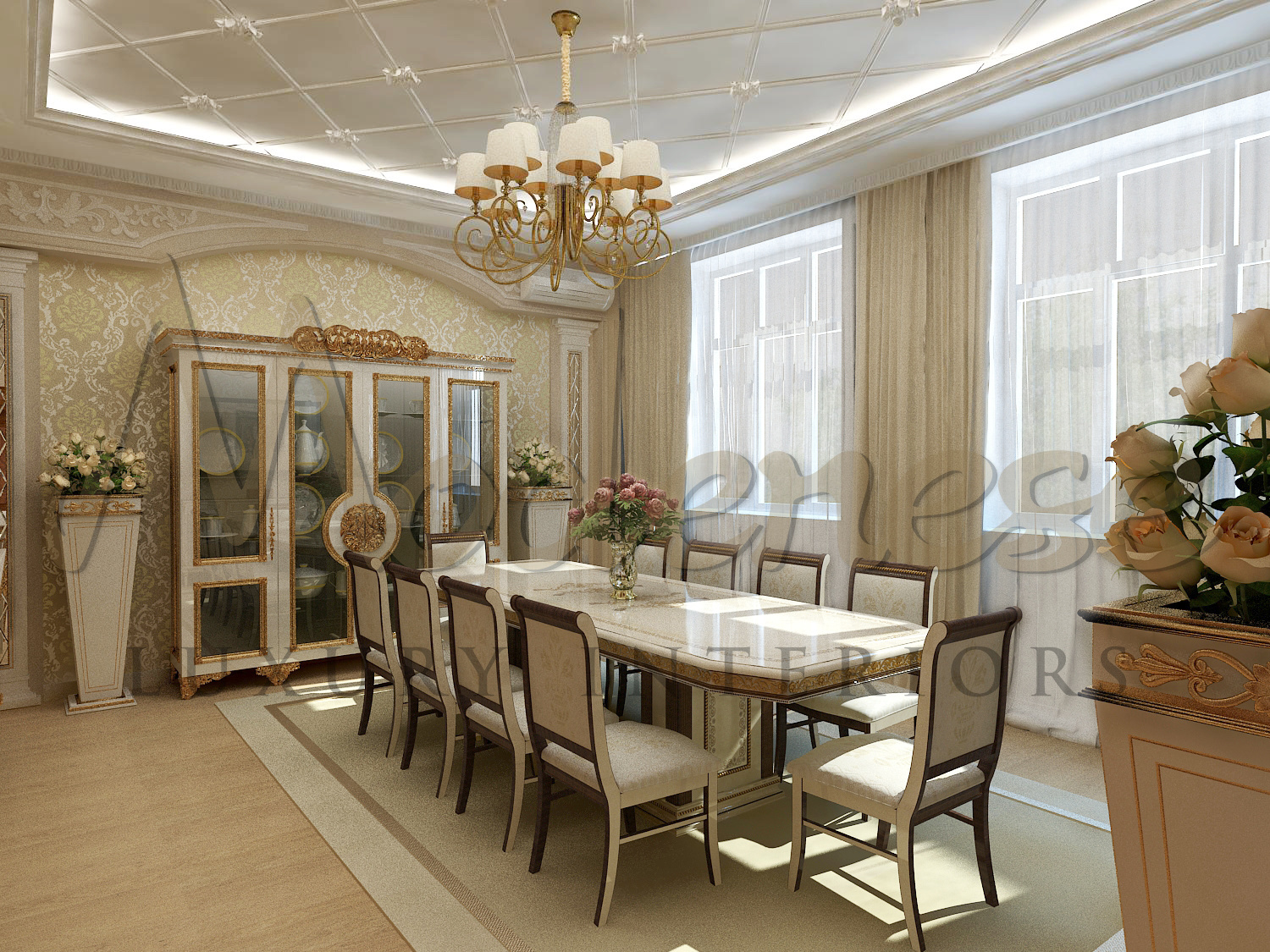 More relaxed and incredibly elegant looks lightweight classics. Its background tones are all representatives of the warm sector of the neutral palette. Classic elements are expressed in more elegant lines. The charm of the interior is added with gilded decorative elements and glossy stretch ceilings.The dining area has a solemn look due to the dining group of Italian furniture made by Modenese Luxury Interiors company.
