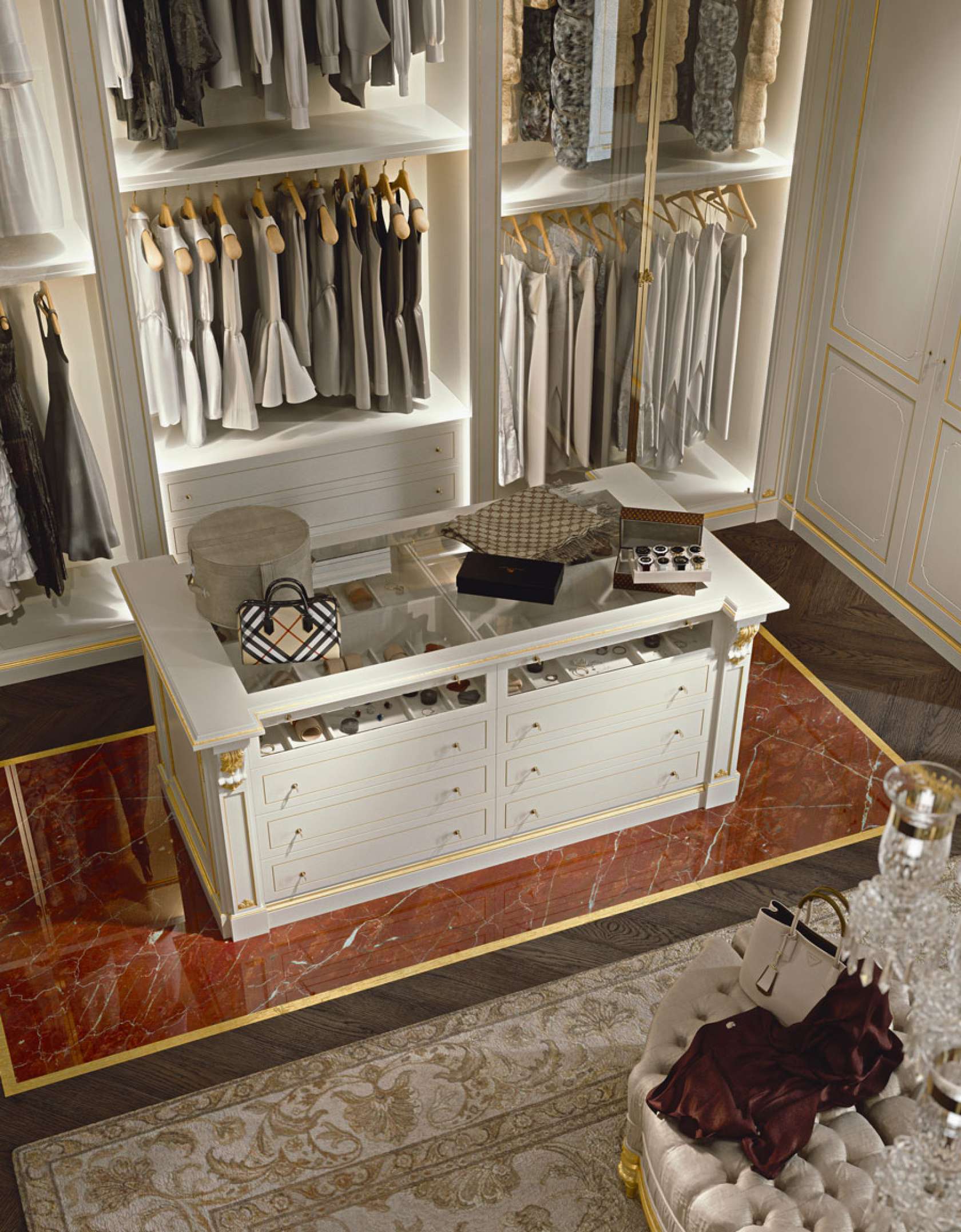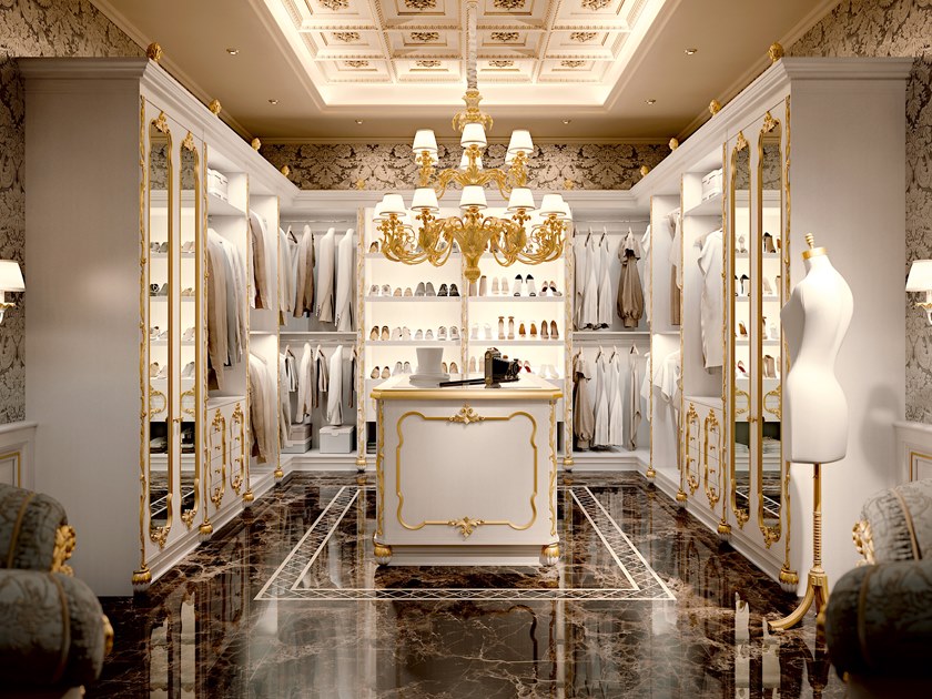 A closet should have at least three types of lighting: above recessed lighting for general illumination, integrated LED lighting under or behind shelves and racks to highlight accessories, and a stunning chandelier for personality and atmosphere. If you have a dressing table, you will also want dedicated lighting.