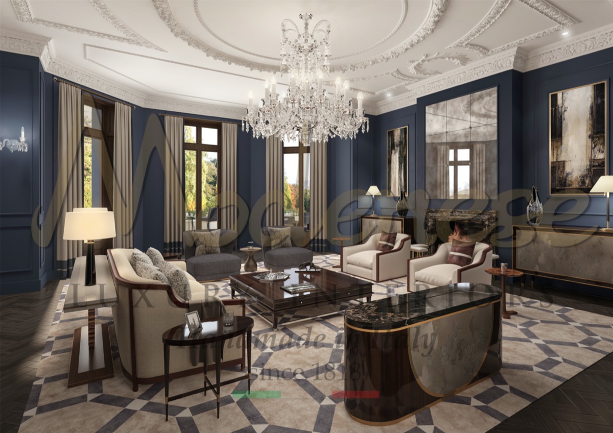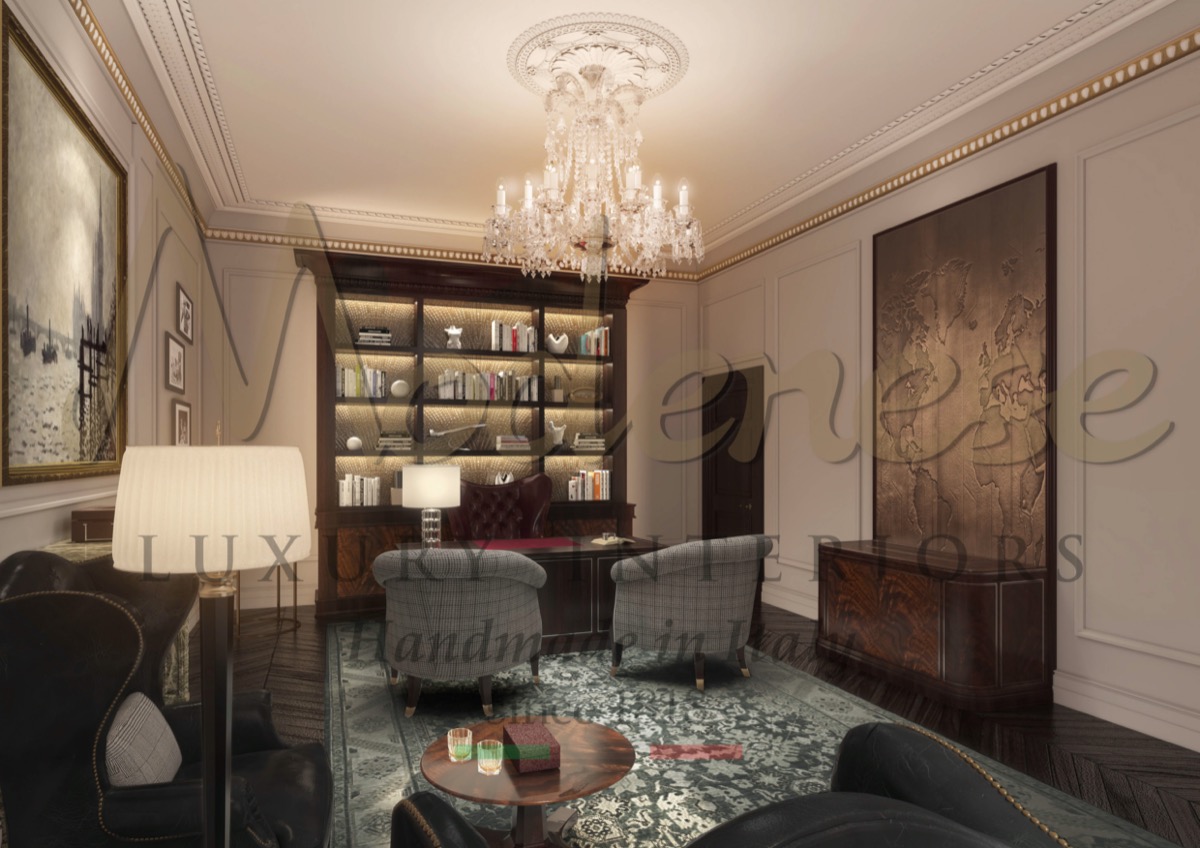 The home office in the interior of this living room looks amazing thanks to the use of royal furniture. Look at these fine lines and pleasing silhouettes!