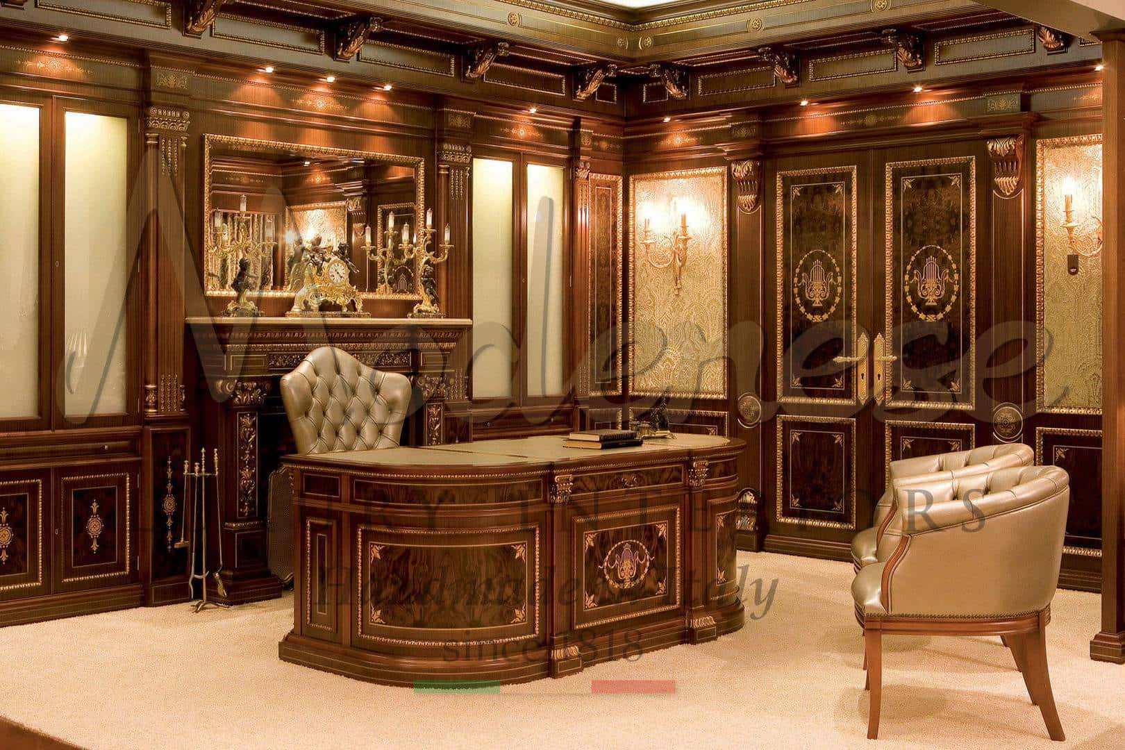 Majestic executive office project with classic style furniture for unique and luxury spaces. Our interior design team will provide you with the best options for your executive office project with exclusive and unique bespoke ideas. Fit out and furniture realization with high-end quality and Italian unique design for royal office projects.