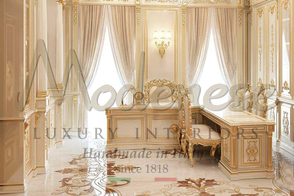 Modenese Luxury Interiors design team will always select for your executive office projects the best solutions of fit out and furniture. Choose our classic boiserie panels, luxury doors, marble floor and majestic chandeliers realized in Italy with care and passion. From baroque opulent style to elegant golden furniture: classy and custom-made products by our artisans with refined wood finishes and precious materials.