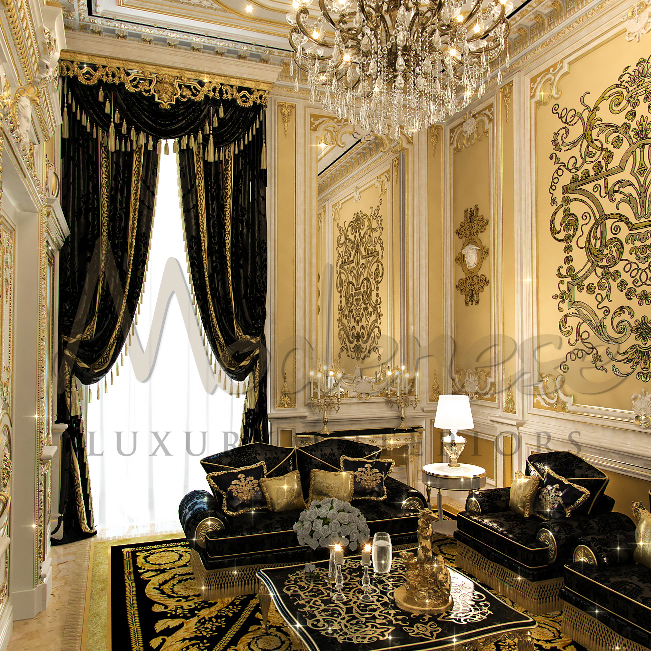 With its gold and blcak sensations, the luxury living room interior design has a wonderful sight. The color combination works well together. The goal of the entire design of the area is to make your time there as enjoyable as possible. It’s comparable to staying in a luxury hotel. Modenese Luxury Interiors has expertise in the luxury interior design industry. This interior decoration is perfect for you and your way of life. The luxurious interior design of the living area and the luxurious lighting go well together. This magnificent accommodation is perfect for you!