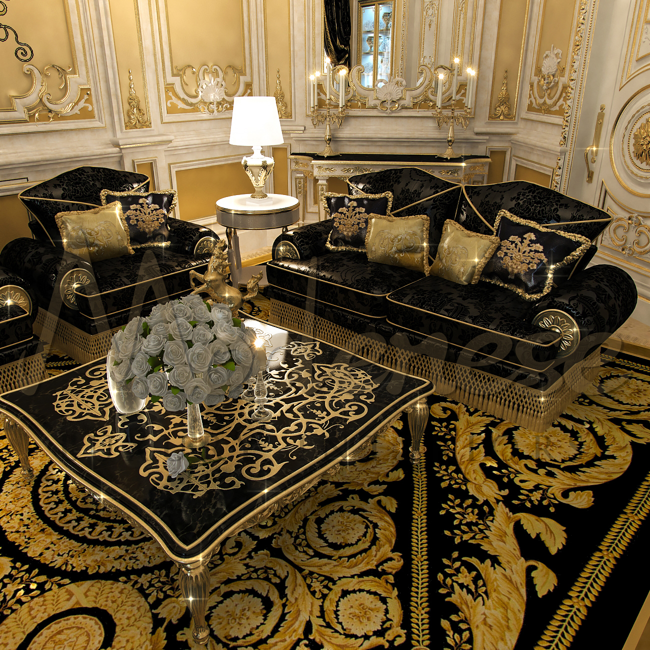 A lovely dining area highlights the fact that visitors are always welcome and that only the best hospitality is provided. Beautiful Italian furniture, of course, plays the principal violin in the orchestra of luxury in the neoclassical design. The living room’s interior is embellished with opulent cabinets made of priceless wood and inlay. Soft chairs have elegant upholstery in a subdued palette of dark colors. A huge window was adorned with silk velvet drapes in a black color. A huge crystal chandelier with a unique design serves as a brilliant touch to the elegant living room decor. Beautifully soft sofas with contrasting upholstery in black adorned the living room area. The atmosphere within is one of cozy, at-home comfort, peace, and tranquility.