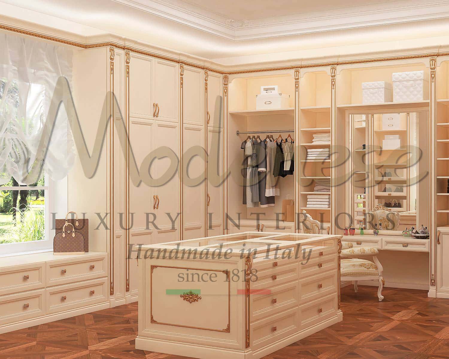 Royal custom-made walk in closet characterized by exclusive Italian design and quality. Our interior design team will create your bespoke dressing with luxurious ornamental inserts like gold and brass details. Decorate your personal corner with the best classic design of Italian traditional craftsmanship. Timeless products designed following our clients’ ideas.
