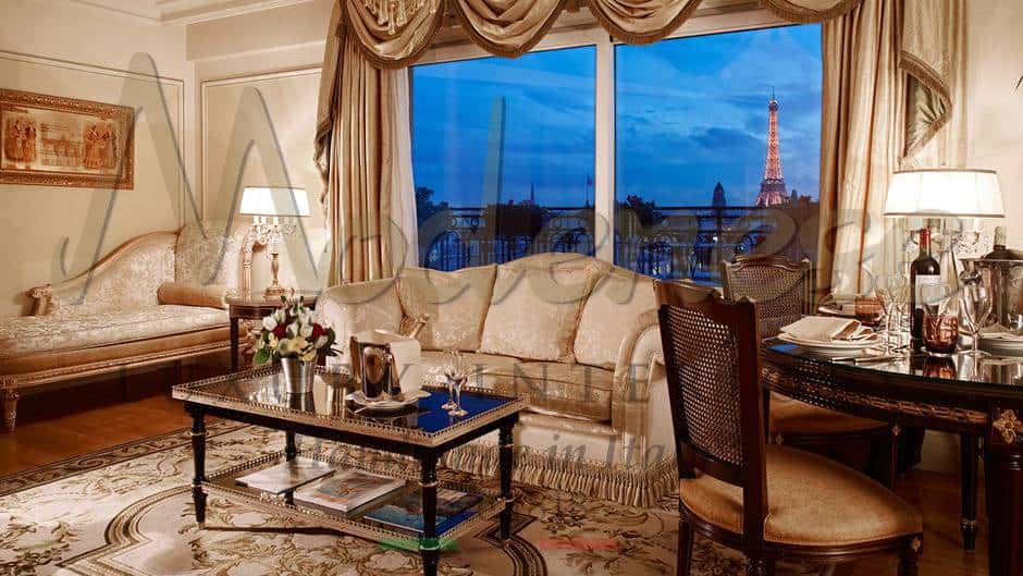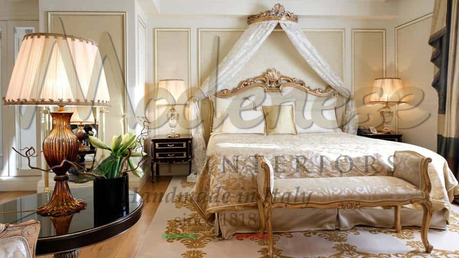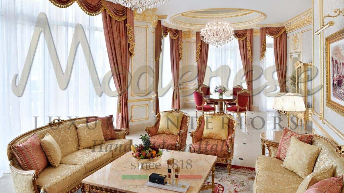 Suites and premium rooms with the best classic Italian furniture by Modenese Luxury Interiors. Bespoke special furniture and fit out, handcrafted for an elegant and classy luxurious space. Timeless hotels furniture with golden details, solid wood materials, handmade carvings, Italian high-end quality, personalized inlays and refined accessories. Our designers have ready the best options for your royal suite decoration.