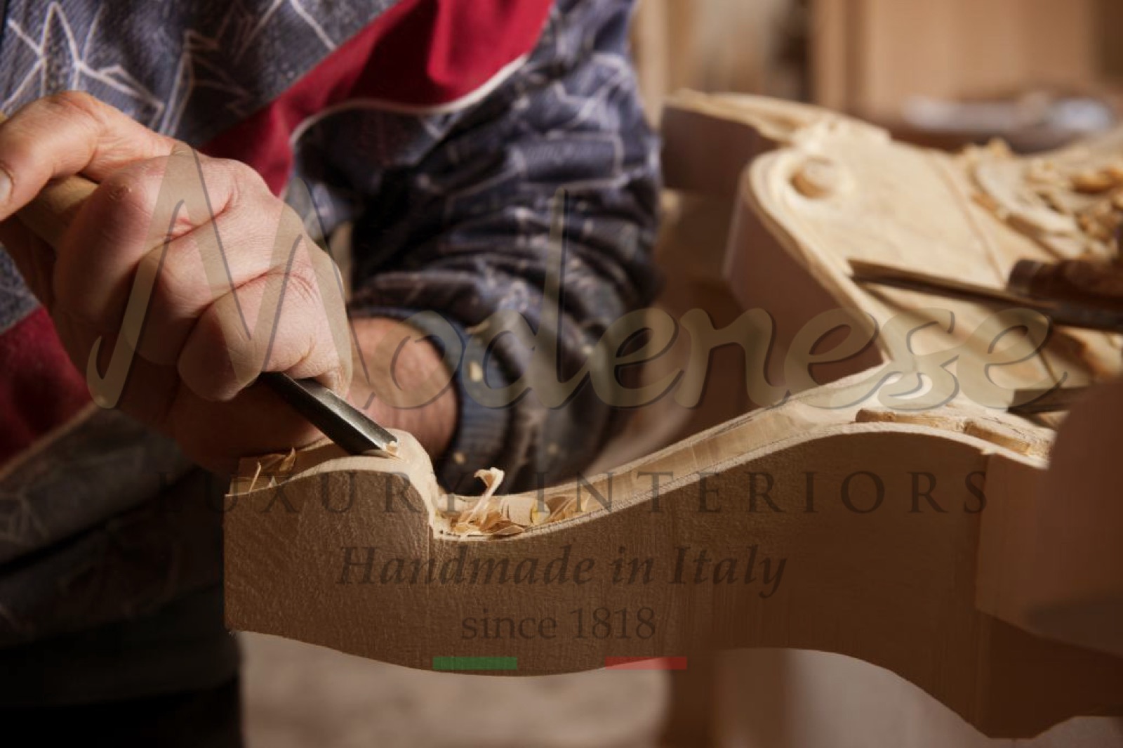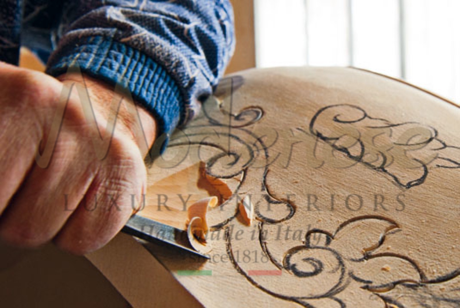 Discover the wood carving technique by visiting our manufacturing in Italy. We guide our clients throughout the different phases of luxury furniture production, with a great attention to the decoration and carving of solid wood.