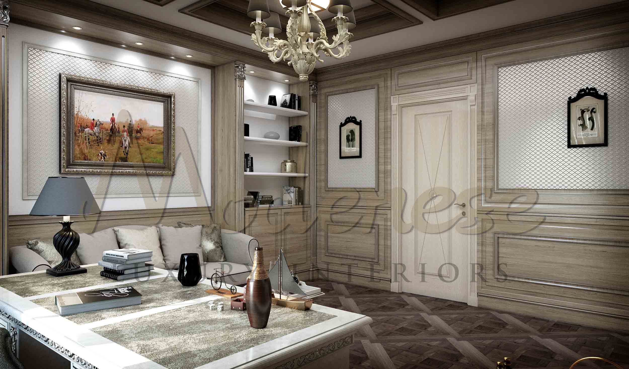Modenese Luxury Interiors possesses all of the technical, creative, intellectual, and personal resources required to create a fantastic interior design for a cottage, a private property, or a rural cottage. While creating interior design, we try to make it unique, creative and tailored to the tastes and needs of the people who will live there. High-quality materials such as parquet and solid wood were used for this trendy office interior. The premium office interior has a very attractive and comfortable aspect thanks to a combination of natural wood, polished in the wall design. The office space is a luxury setting for efficient work, with comfy furniture upholstered in genuine fabrics and elegant wall design, ceiling, and floor decor.