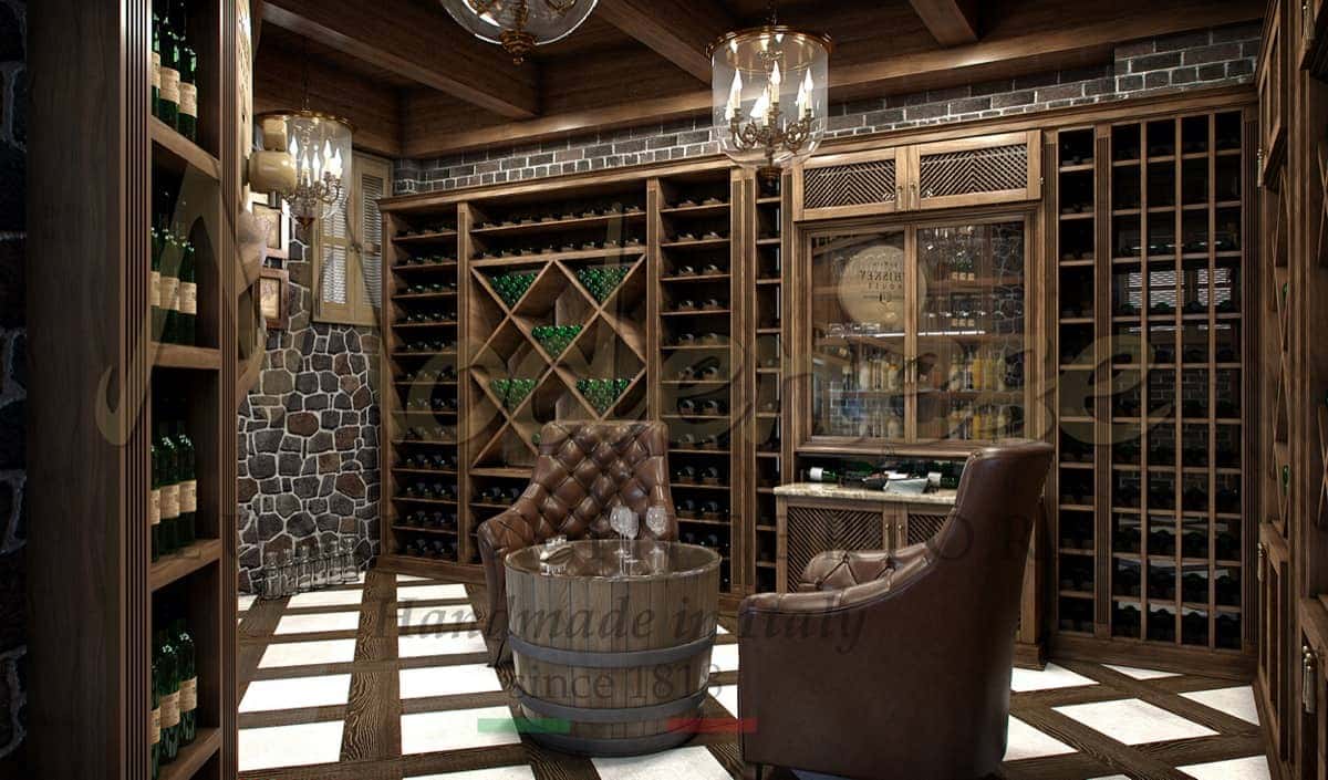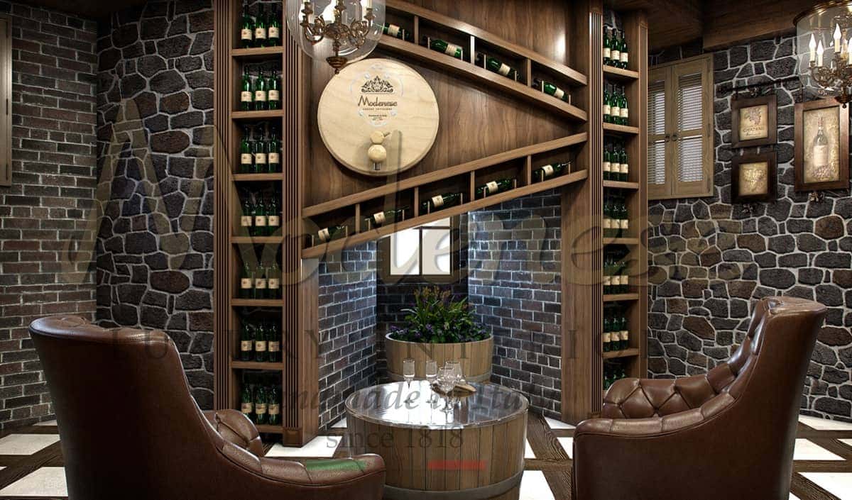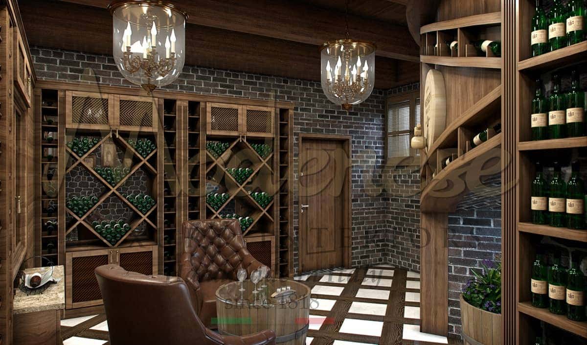 Bespoke made in Italy handcrafted luxury interiors by Modenese and exclusive classic style design are the focal points of this magnificent and successful solid wooden wine cellar project.