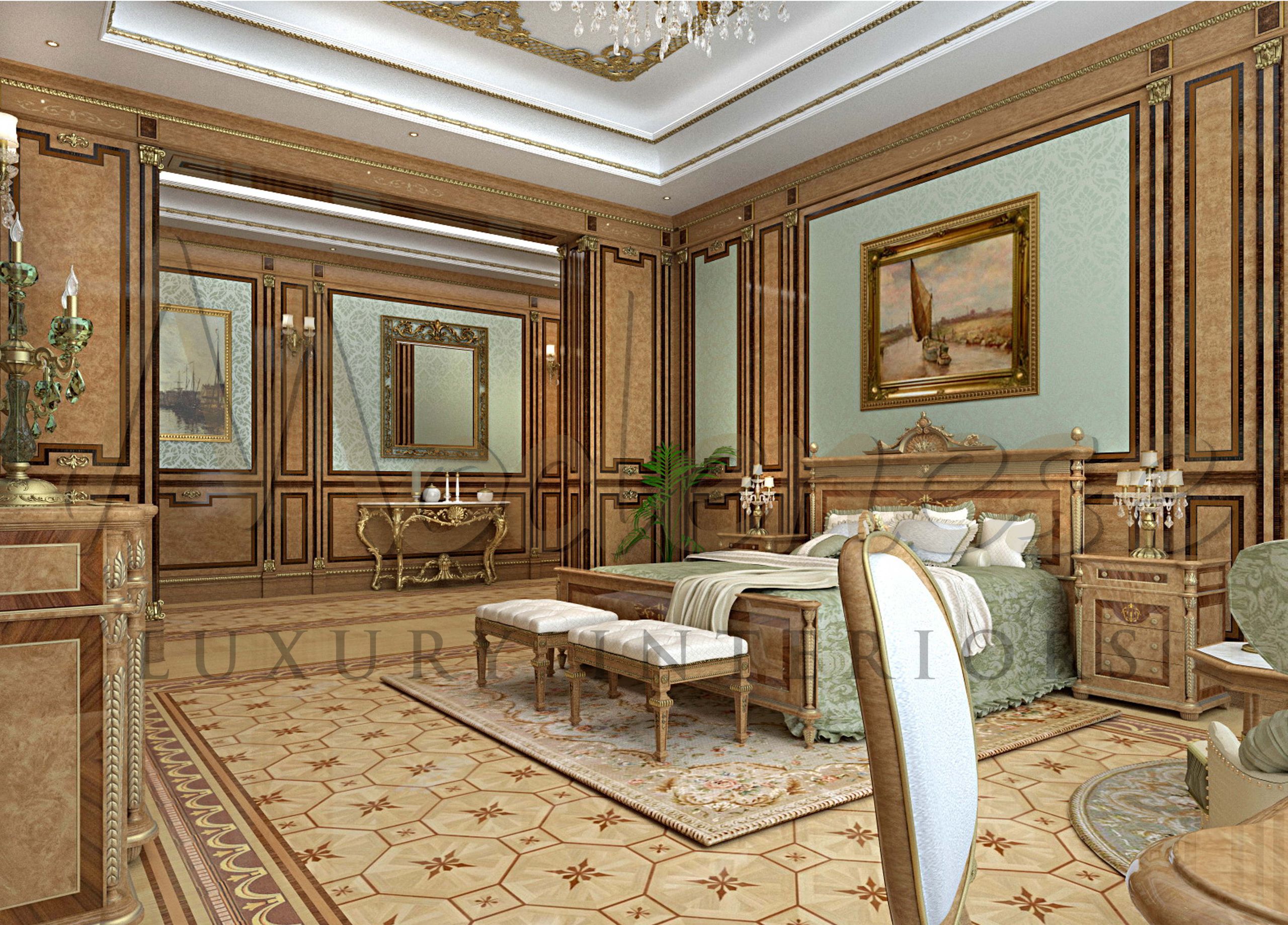 Classic style of bedroom furniture with custom-made wooden panels enrich this elegant royal project: entirely designed and carefully created by our architects to reach the great evaluation of the walls and to transform the look of the room by enhancing its unique charm.