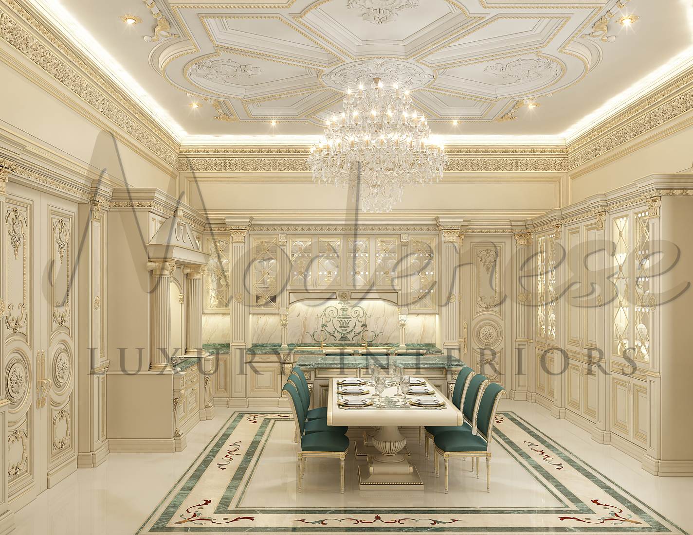 The traditional luxury kitchen in classic style and refined glamour will attract people who value wealthy confidence and refined taste. Furniture for a traditional kitchen is made of wood and fine upholstery materials, with curved tables, chairs, and cabinets. Finishing materials such as veneer or pricey washable wallpaper with a floral or geometric pattern are appropriate for this area. Curbs, panels, mouldings, or boiserie: panels of wood can be used to embellish the walls of a classical kitchen – this is a luxury kitchen choice. This wall decoration will add a touch of aristocracy to your kitchen! Classical kitchen design from Modenese Luxury Interiors – is luxurious high-end space, when beauty and quality combined with a well thought-out interior.