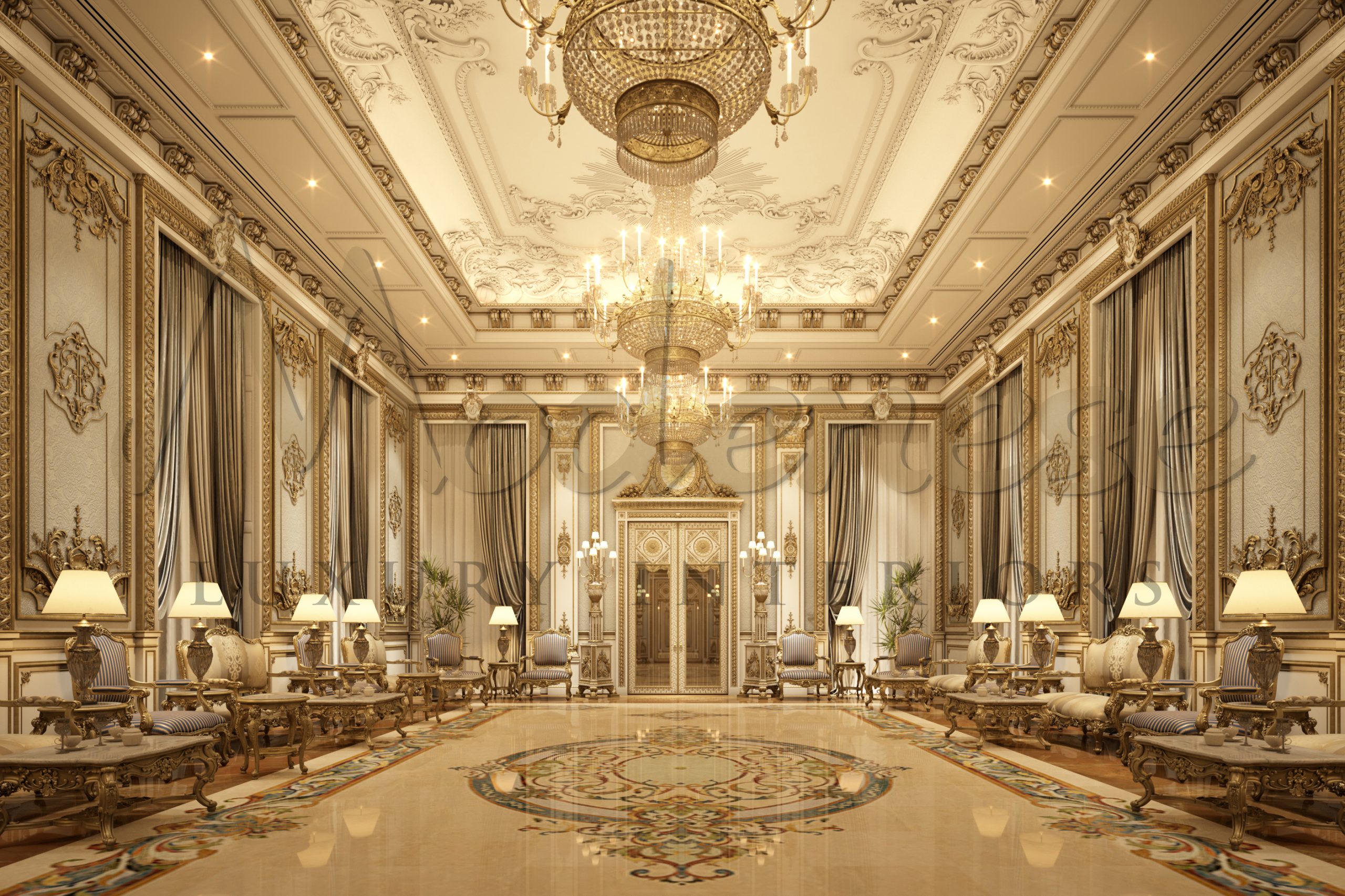 Harmony, symmetry, and only natural and high-quality materials define the Luxury Majlis in Jeddah in the classic style from Modenese Luxury Interiors. Finishing materials, furniture, color palette, decorations, and accessories are all affected. When creating a Luxury Majlis, remember that this style of decor although rich, but does not like congestions. It would be wrong to have too many details or accessories. Everything must be strong and respectable here, and every aspect, even the tiniest, is chosen with care, because it is the details that make the big picture.