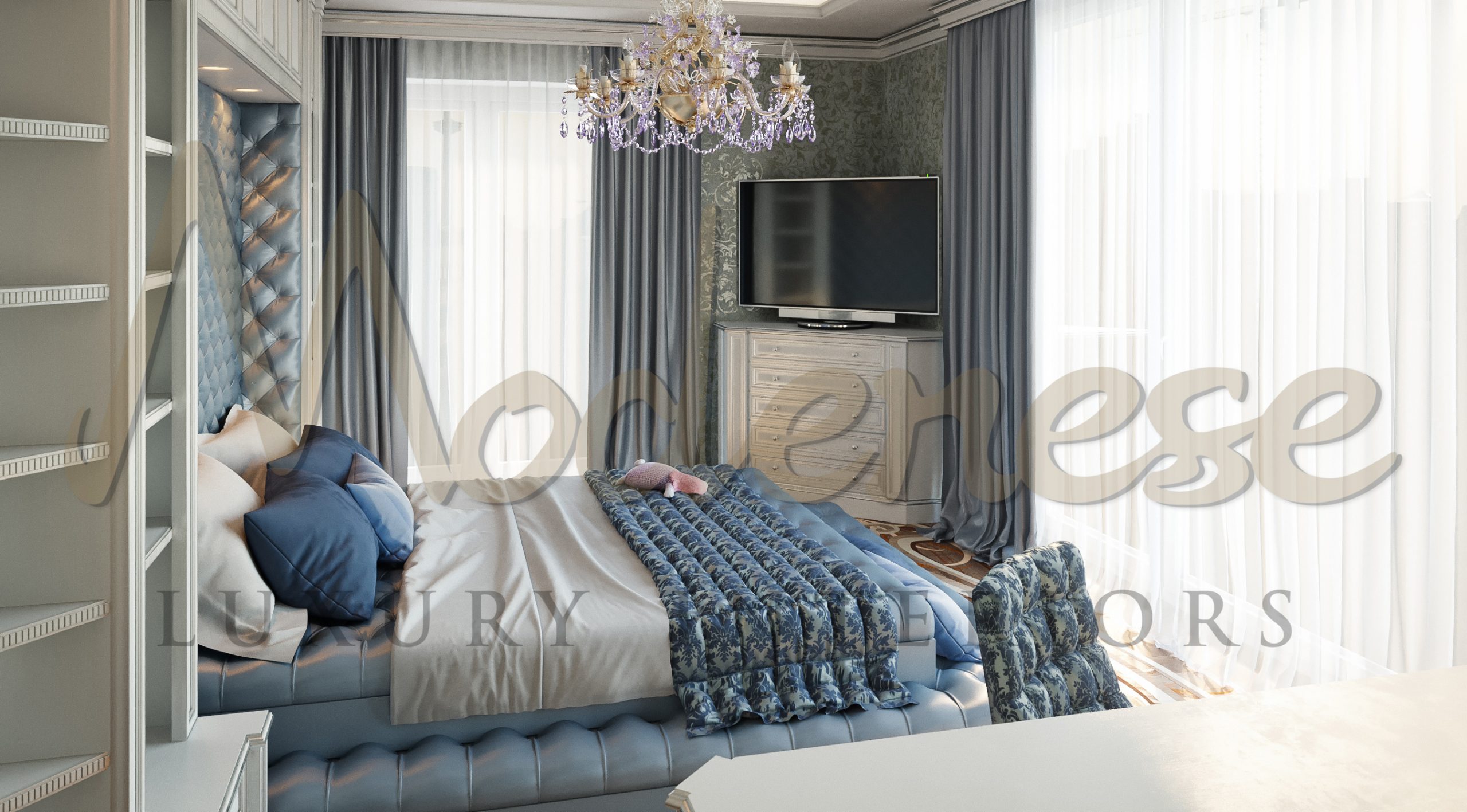 Here’s proof that blue can thrive in a variety of settings and take on a completely different appearance. This bedroom, designed by Modenese Luxury Interiors, has an inviting and exquisite feel to it, while still being polished and sophisticated.