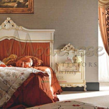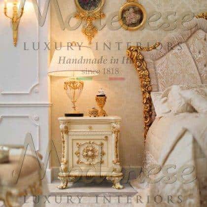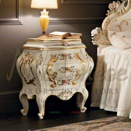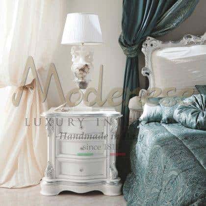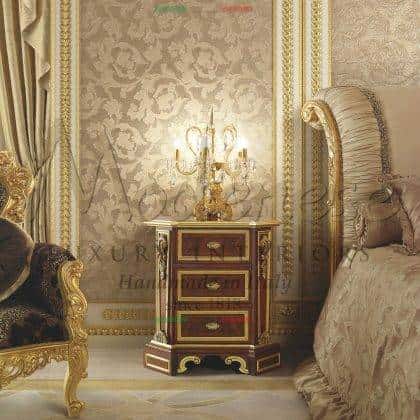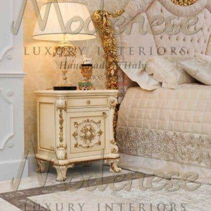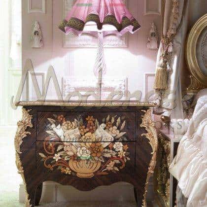 Modenese Interiors designs and creates the most luxurious night tables to match perfectly your majestic bed, which complement the furnishing of your elegant master bedroom. Each piece is accurately handmade by expert Italian artisans. Traditional made in Italy solid wood structures of our night tables are all well refined with handmade golden leaf decorations, personalized details or customized marquetry and mother-of-pearl inlays.