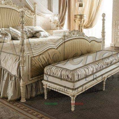 Modenese luxury sophisticated classic style pouffes and benches collection is suitable for all the furnishing projects thanks to its great versatility. Refined materials, timeless design, handmade decorations will compose your perfect dressing pouffe, bed or grand piano bench. Each piece of furniture handcrafted by Italian master artisans may be tailor-made according to your own taste. Embellished baroque design pouffes with made in Italy fabrics combinations or brightened up fully upholstered benches with exclusive Swarovski elements are part of a long creative and attentive tradition.