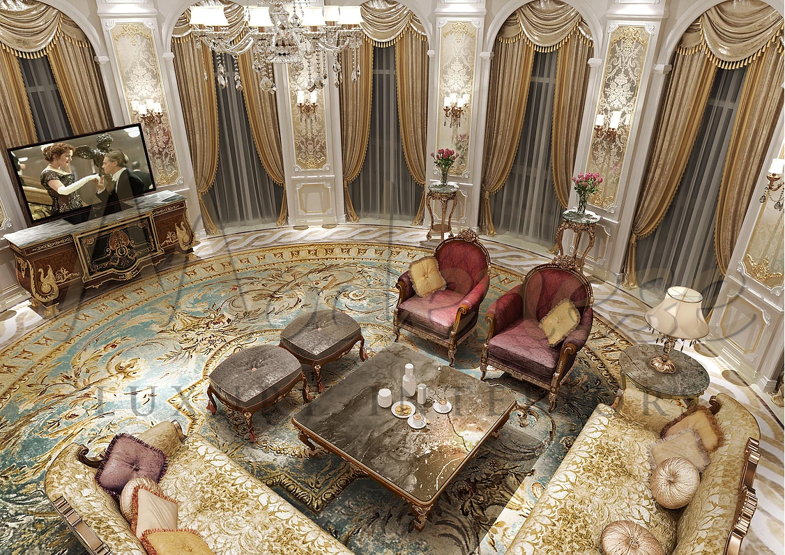 The classic interior design consists of many details. When interior designers at Modenese Luxury Interiors create an interior design, they consider all of the elements: the house owner’s taste preferences, aesthetic perspectives, housing technological features, and so on. All rooms have a practical purpose, as well as colour design and lighting preferences, as well as materials, furniture, equipment, and even technics. We are pleased to present the classic interior design of the living room, which is underlined and manifested by elegant furnishings and antique decor items, amazing expensive textiles- velvet, cashmere, silk and great fabrics for soft padded sofas, elaborate stucco mouldings in a mix of wood panelling, and intricate floor marble patterns. Unique wall decoration is applied in this fantastic UAE house design project.