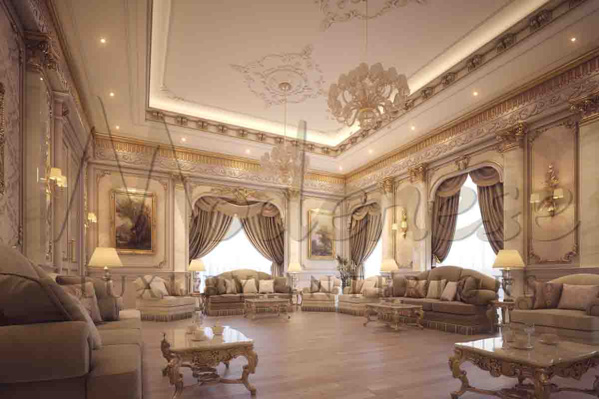Classic furniture in this magnificent house design of the living room in Mecca by Modenese Luxury Interiors is of extraordinarily high quality and hand-made in Italy.