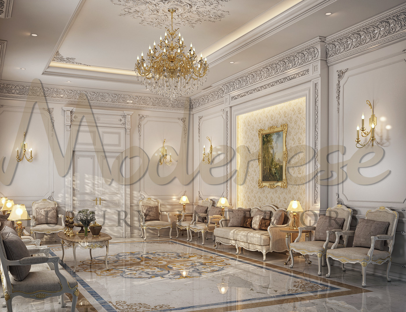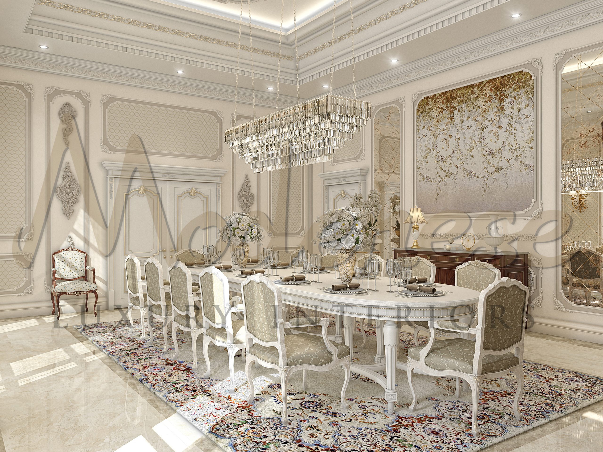 We offer you to decorate the interior of the dining room with elegant Italian furniture.Exclusive furniture from Modenese Luxury Interiors meets the latest fashion requirements in interior design. Classic furniture made by Italian craftsmen will harmoniously fit into the interior of the dining room. History and modernity, practicality and luxury are intricately intertwined in its design. The work of Italian masters is amazing – it is always a sophisticated design, impeccable quality, amazing finishes, environmentally friendly wood and fittings.