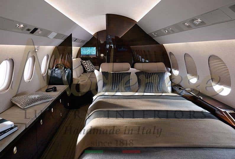 Enjoy the real comfort of Modenese private jets interiors: exclusive reclining armchairs, luxurious decorations, functional bespoke accessories for a pleasant flight. Best quality and design service for your private jet in traditional Italian style: all the elements are always studied in detail to guarantee the most exclusive journey on board of an elegant made in Italy designed jet interior project.