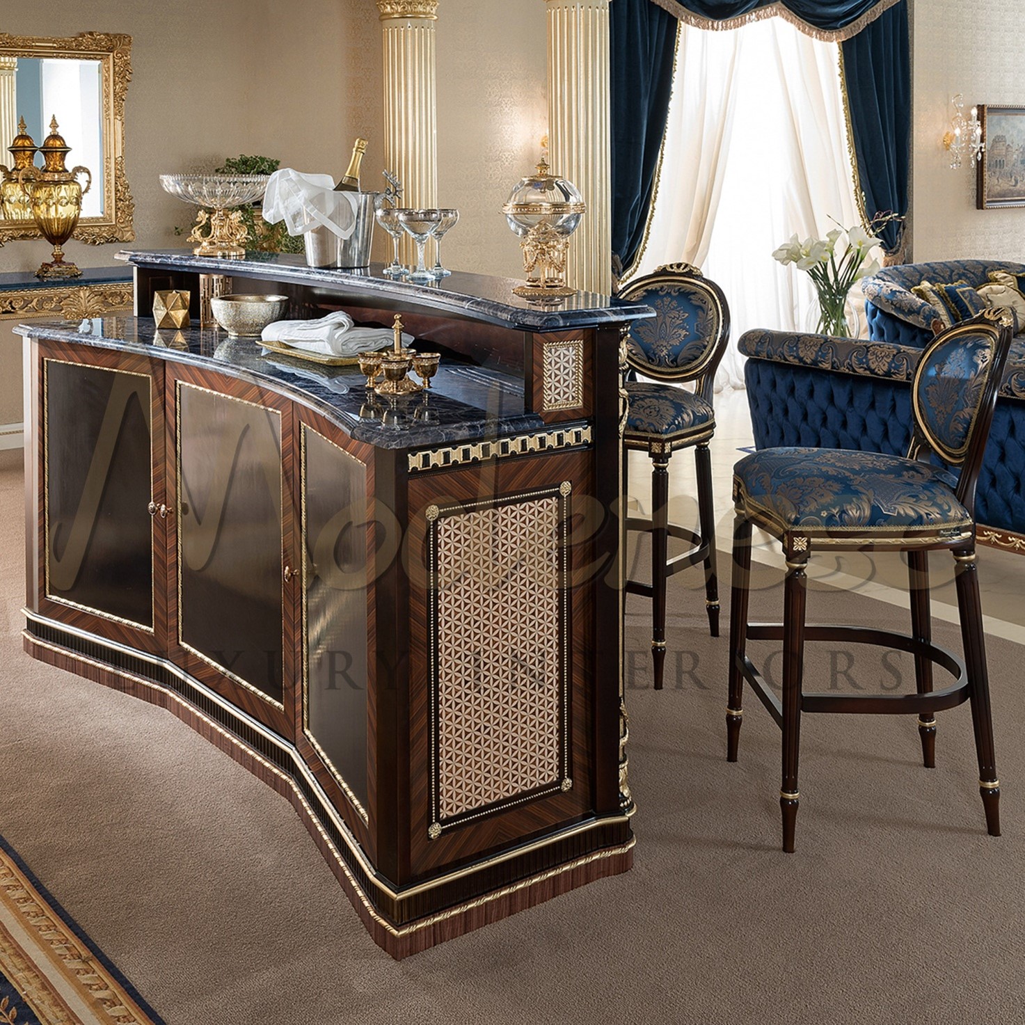 Elegant carved legs and armrests, impeccable wax polishing, elegant gilding elements, and gorgeous inlaid. The company specializes in the production of furniture products in classic style and designs real furniture masterpieces. Italian upholstered furniture Regency of Modenese Luxury interiors factory will be a pertinent addition to a living room, cabinet, or dining room, and thanks to the excellent quality of the filling and good ergonomic properties, they provide homeowners with unique comfort. Classic products are a luxury set of sofas, which do not lose popularity due to the variability of interior trends.
